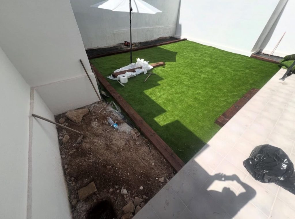 De patio olvidado a rincón con estilo: renovación completa con césped artificial y acabados decorativos