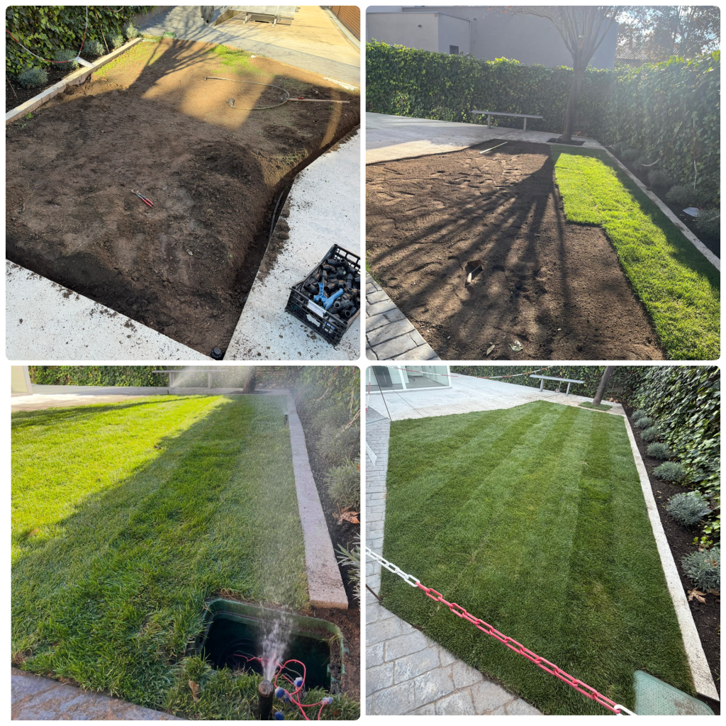 Instalación de césped natural en vivienda particular. Preparación del terreno, nivelación, instalación del riego y colocación del tepes.